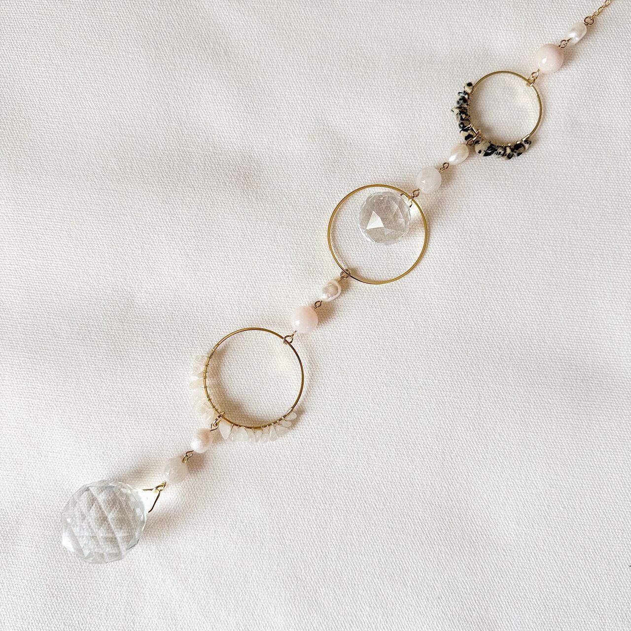 白の質感の違いが美しいムーンストーン×淡水パール×ダルメシアンジャスパーの大人っぽい雰囲気のサンキャッチャーです。