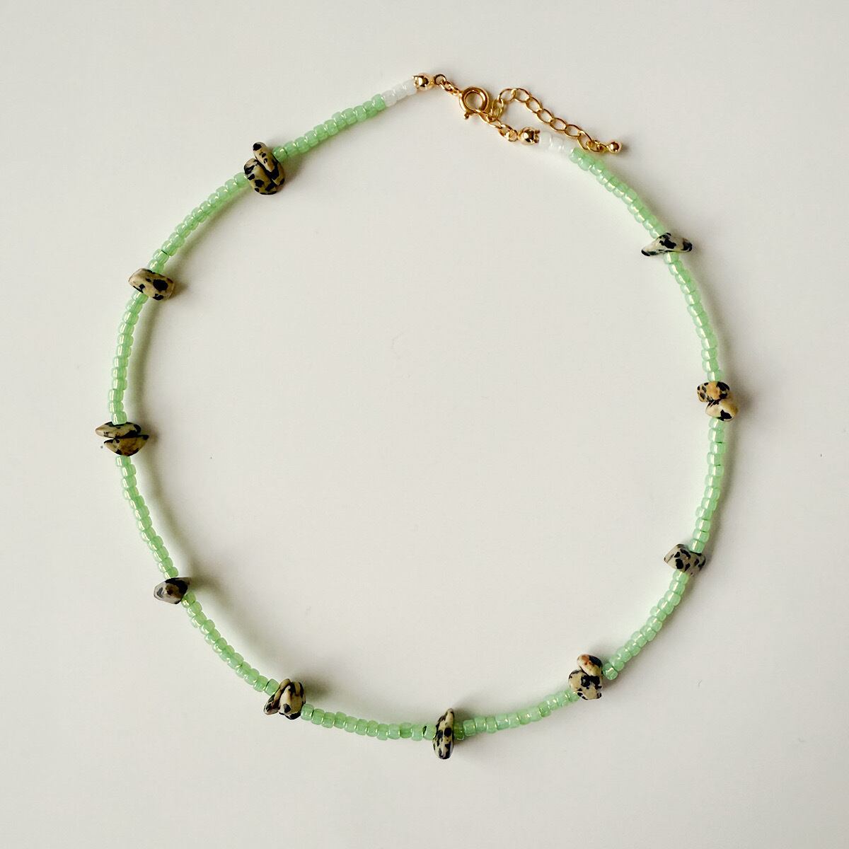 天然石ダルメシアンジャスパー×パステルグリーンビーズのチョーカー風ネックレスです。